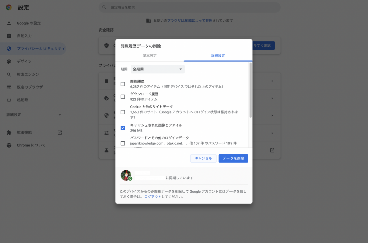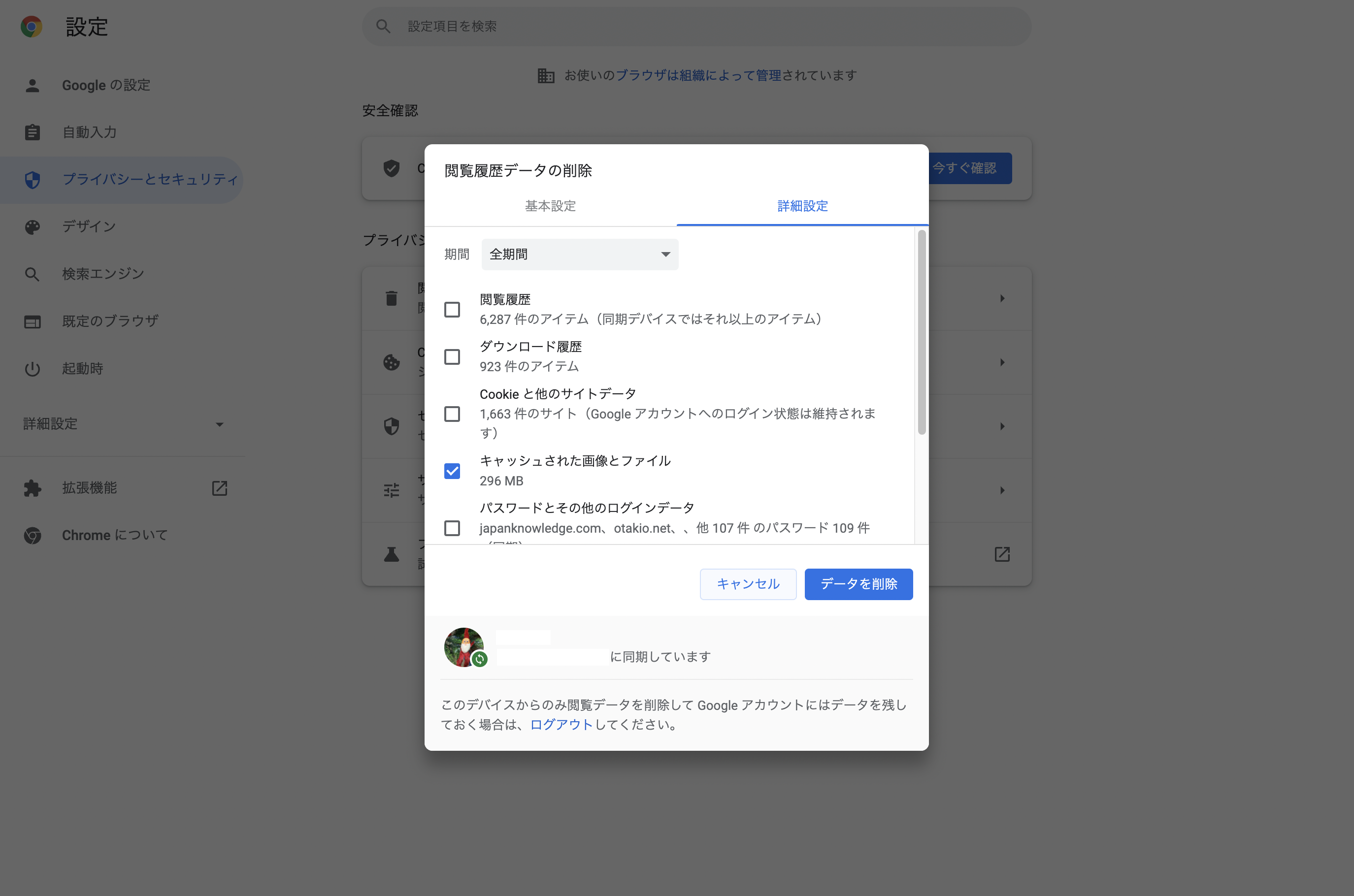 ・Chrome: メニューの「Chrome」から「閲覧履歴を消去…」を選択し、「キャッシュされた画像とファイル」にチェックを入れた状態で「データを削除」をクリックする(他のところにはチェックを入れなくていい)。