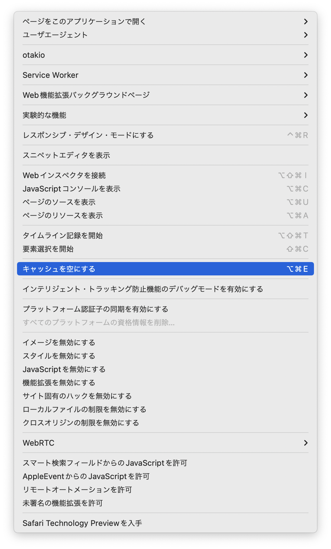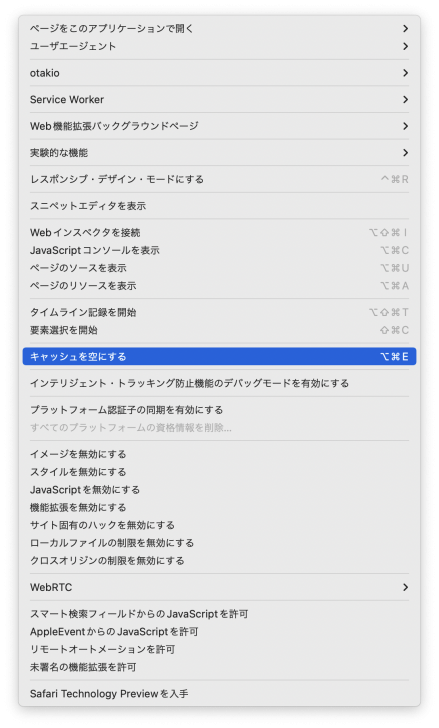 ・Safari: メニューの「開発」>「キャッシュを空にする」をクリックする。