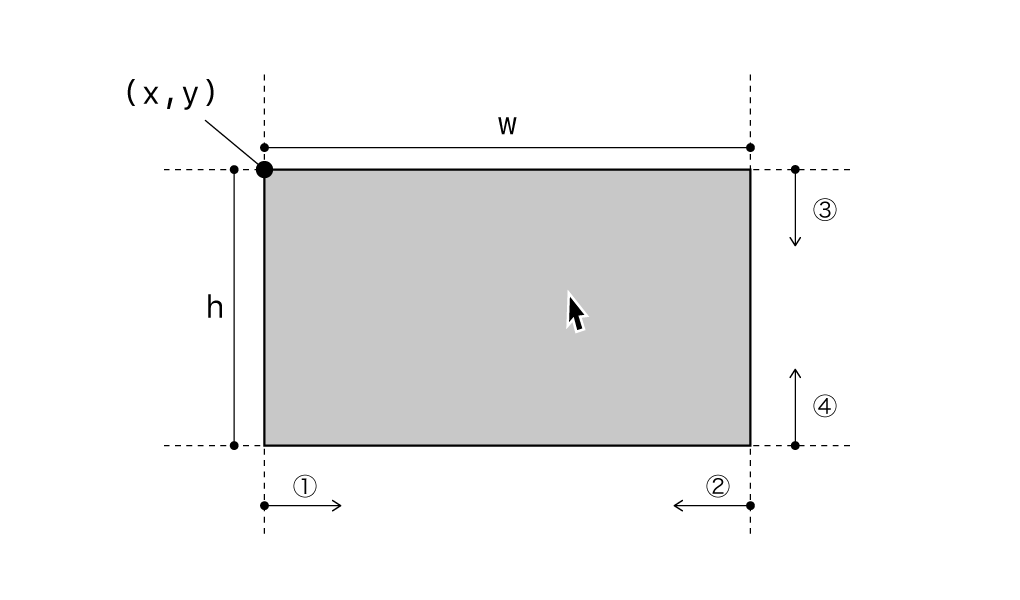 の4つの条件が全て満たされた場合になります。この長方形の4つの辺の座標さえわかれば、その値とマウスの座標を比較することで「マウスが長方形に乗っているかどうか」が判定できるはずだとわかります。