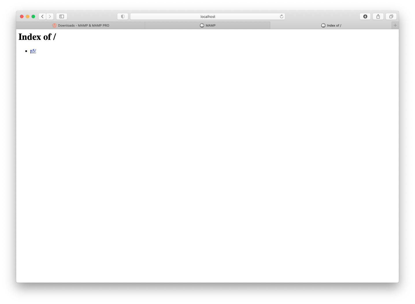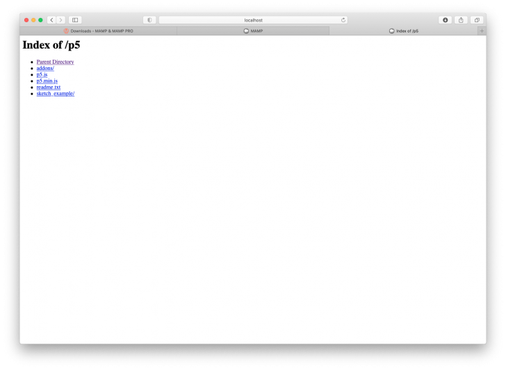 スケッチが正常に表示されればMAMPの設定は終了です。これからはこの「Sites > p5」フォルダの中にスケッチを作り、ブラウザの「localhost」から開く、というプロセスに変わります。