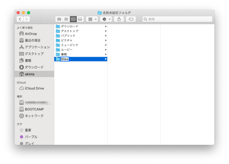 サーバー用のフォルダを作るために一旦Finderを開きます。自分のホームディレクトリ(ユーザ名のフォルダ)直下に新規フォルダを作り、「Sites」という名前にします(既にSitesフォルダが存在する場合は、そのままで結構です)。