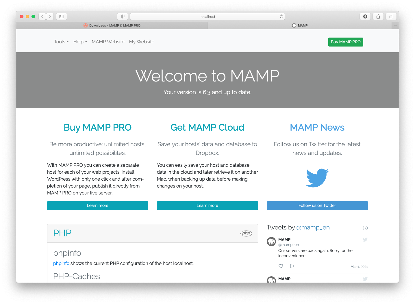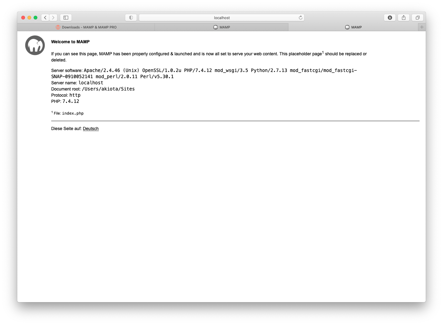 数秒後Webブラウザが起動して下のような画面が出ればMAMPの起動成功です。