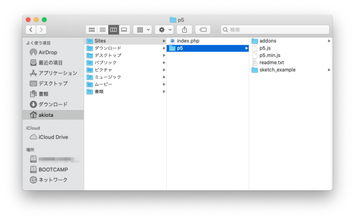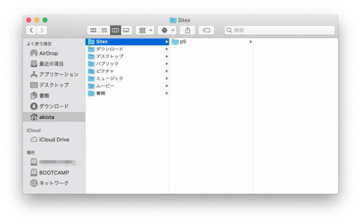 では、この「Sites」フォルダに実際にファイルを入れてみます。Finderで「Sites」を開き、その中に今まで作業していた「p5」フォルダを移動します。