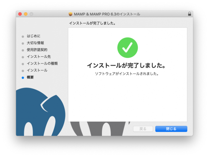 インストールが完了したら「閉じる」ボタンを押します。