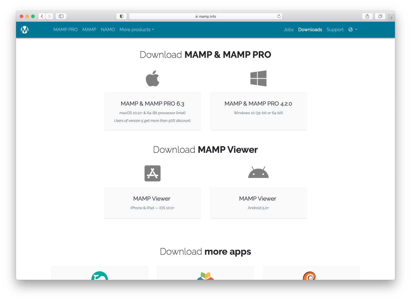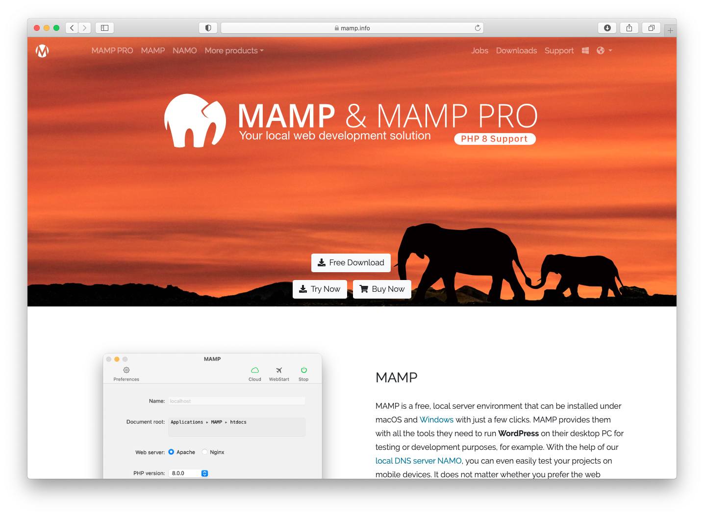 MAMPのサイトにアクセスします。「Free Download」と書いたボタンをクリックします。