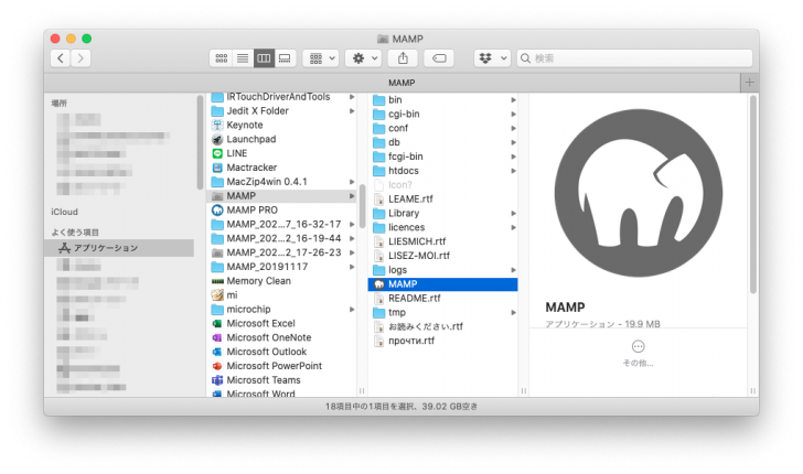 インストールが完了すると「アプリケーション」フォルダに「MAMP」というフォルダができているので(※「MAMP PRO」のほうではありません)、その中の「MAMP」というアプリケーションファイルを開きます。