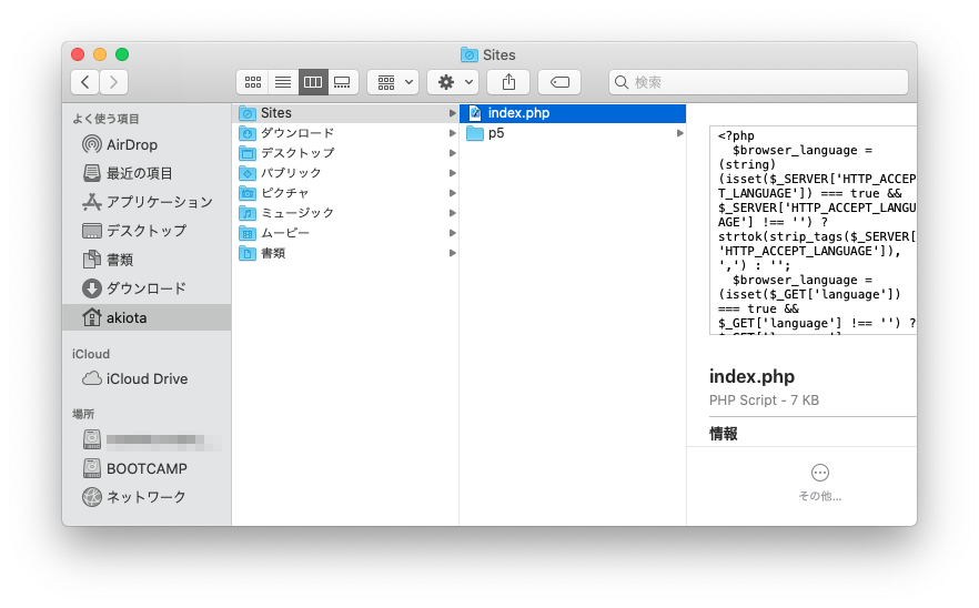 いつの間にか「Sites」フォルダの中に「index.php」というファイルができていますが、これはサーバーが起動しているというメッセージを出すためだけのファイルなので、不要です。削除してください。