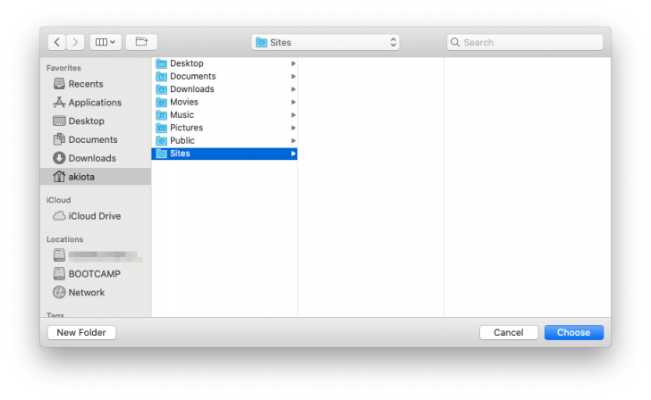 ここで、先ほど作った「Sites」フォルダを選択します。選択したら右下の「Choose」ボタンを押してください。