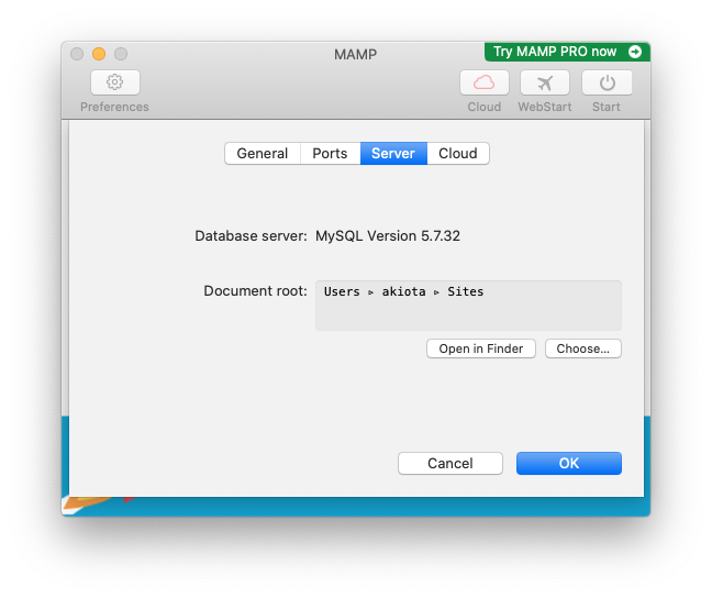 もう一度MAMPに戻り、「Document root:」と書いた枠の右下にある「Choose…」をクリックします。