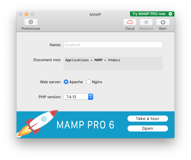 MAMPが起動すると下のようなホーム画面が開きます。環境設定をするために左上の歯車型アイコンのついた「Preferences」ボタンを押してください。