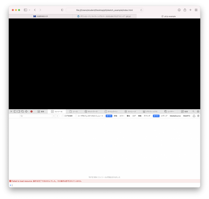 ダウンロードしたサンプルスケッチがSafari上で動かないという症例が出ていますが、これはSafariのセキュリティ設定が高めに設定されているせいだと思われます。症状としては、下のスクリーンショットのように画面が真っ黒なままで、JavaScriptコンソールで見ると「Failed to load resource: 操作を完了できませんでした。その操作は許可されていません」と出ます。