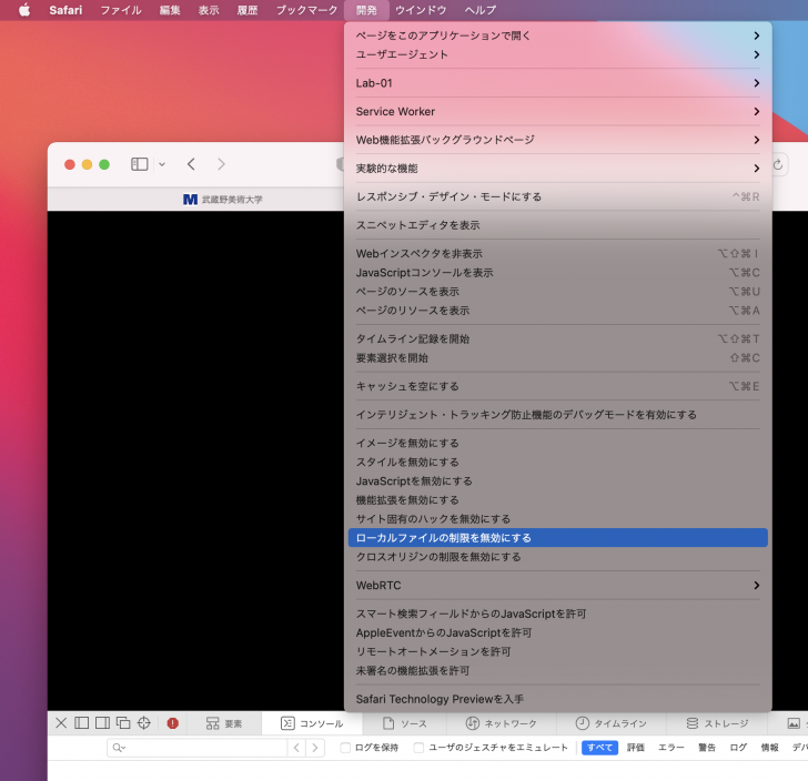 メニューの「開発」から「ローカルファイルの制限を無効にする」を選択します。