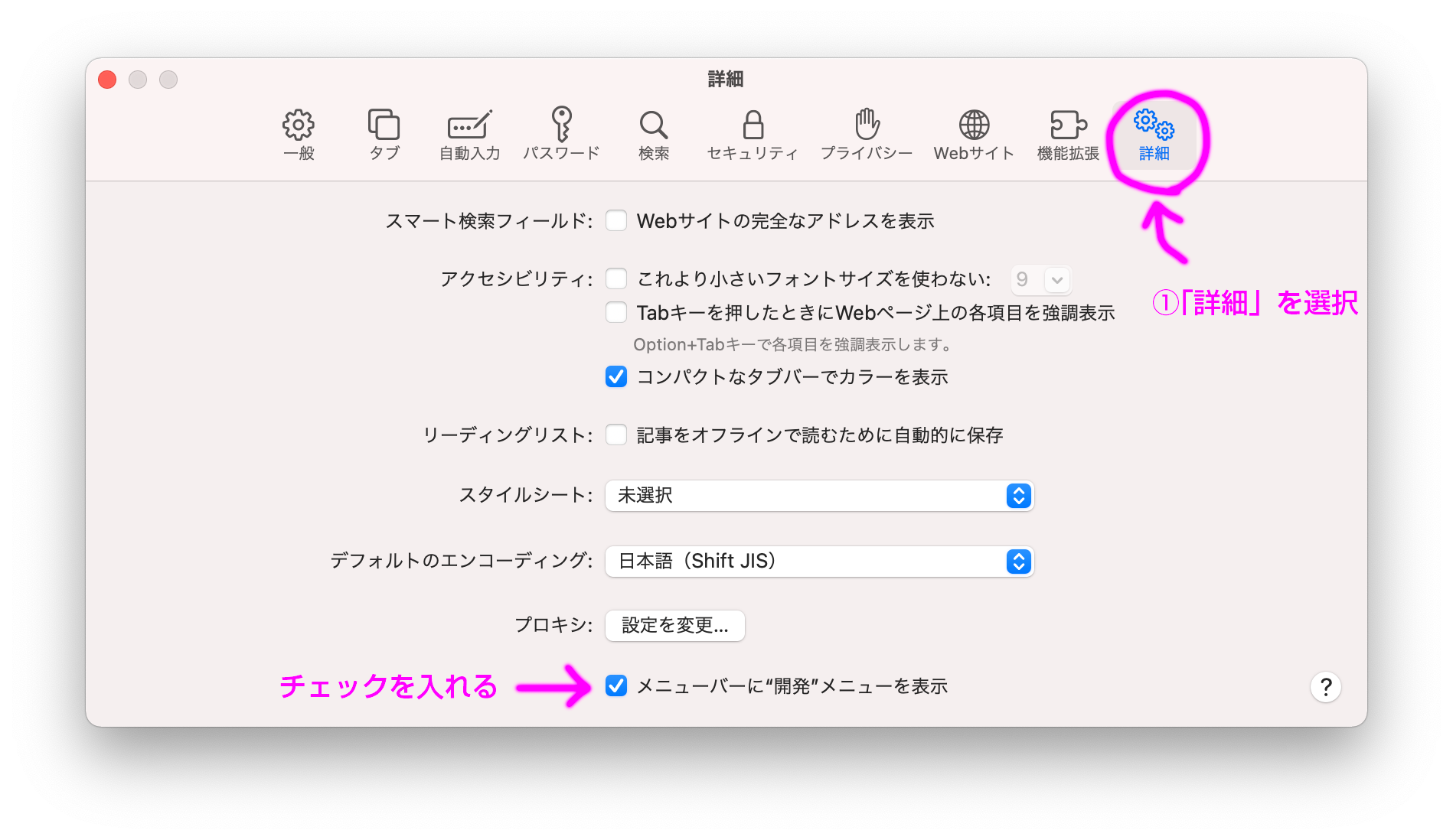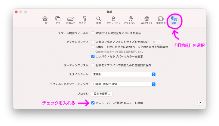 「詳細」タブをクリックした後、一番下の「メニューバーに“開発”メニューを表示」にチェックを入れておきます。